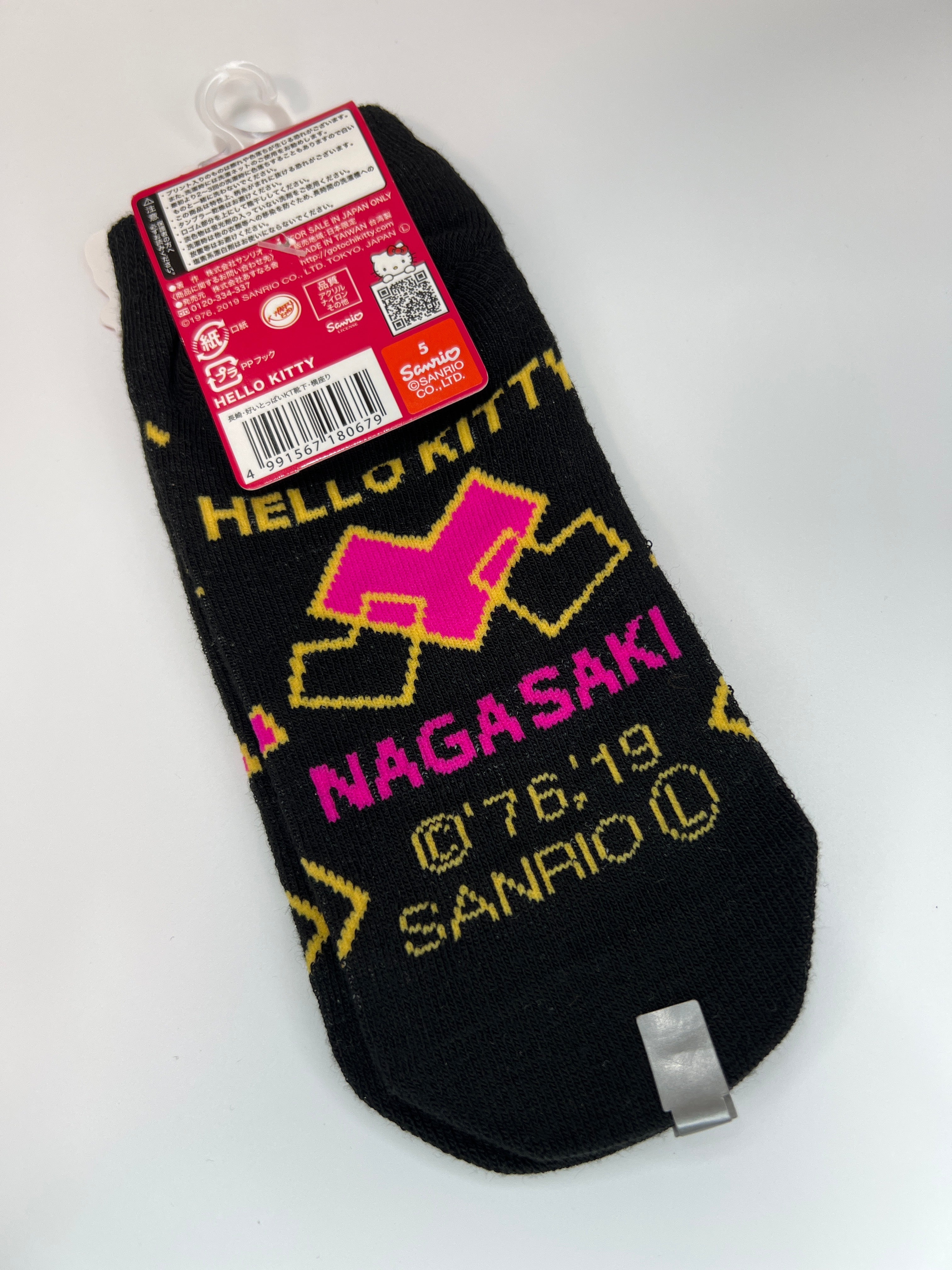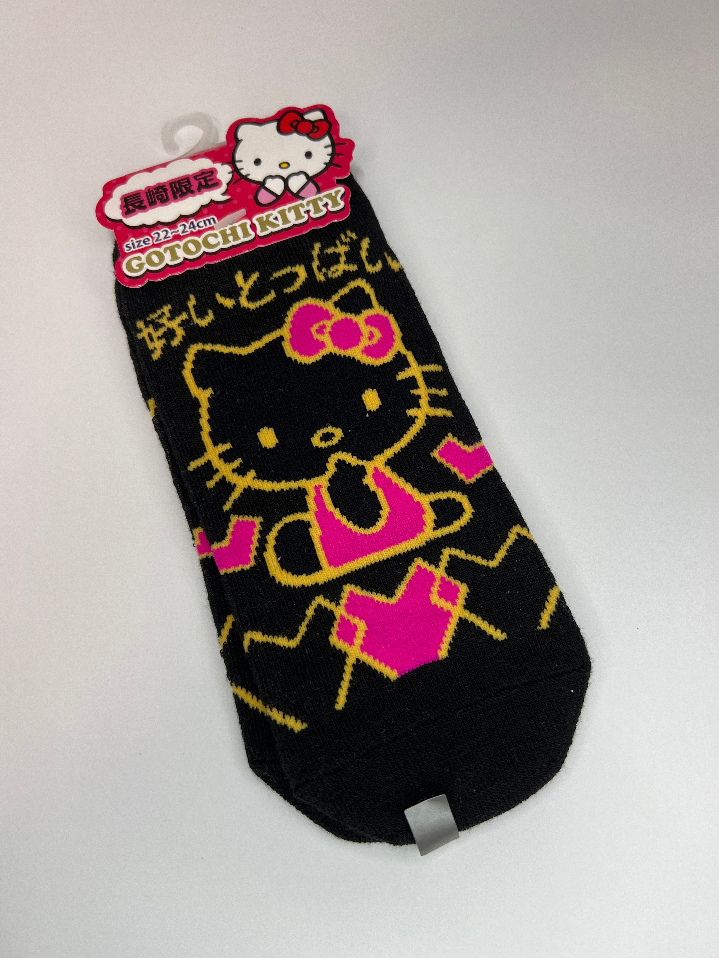 Rock a bold statement with these Nagasaki-exclusive Hello Kitty socks! Striking black paired with hot pink creates an edgy-cute vibe that's anything but ordinary. Designed for feet measuring 22-24 cm, these limited-edition gotochi socks capture the spirit of Nagasaki while celebrating everyone's favorite bow-wearing icon. Whether you're a devoted Sanrio collector or simply love regional treasures, these socks bring personality and pizzazz to your wardrobe. Grab yours before they're gone!