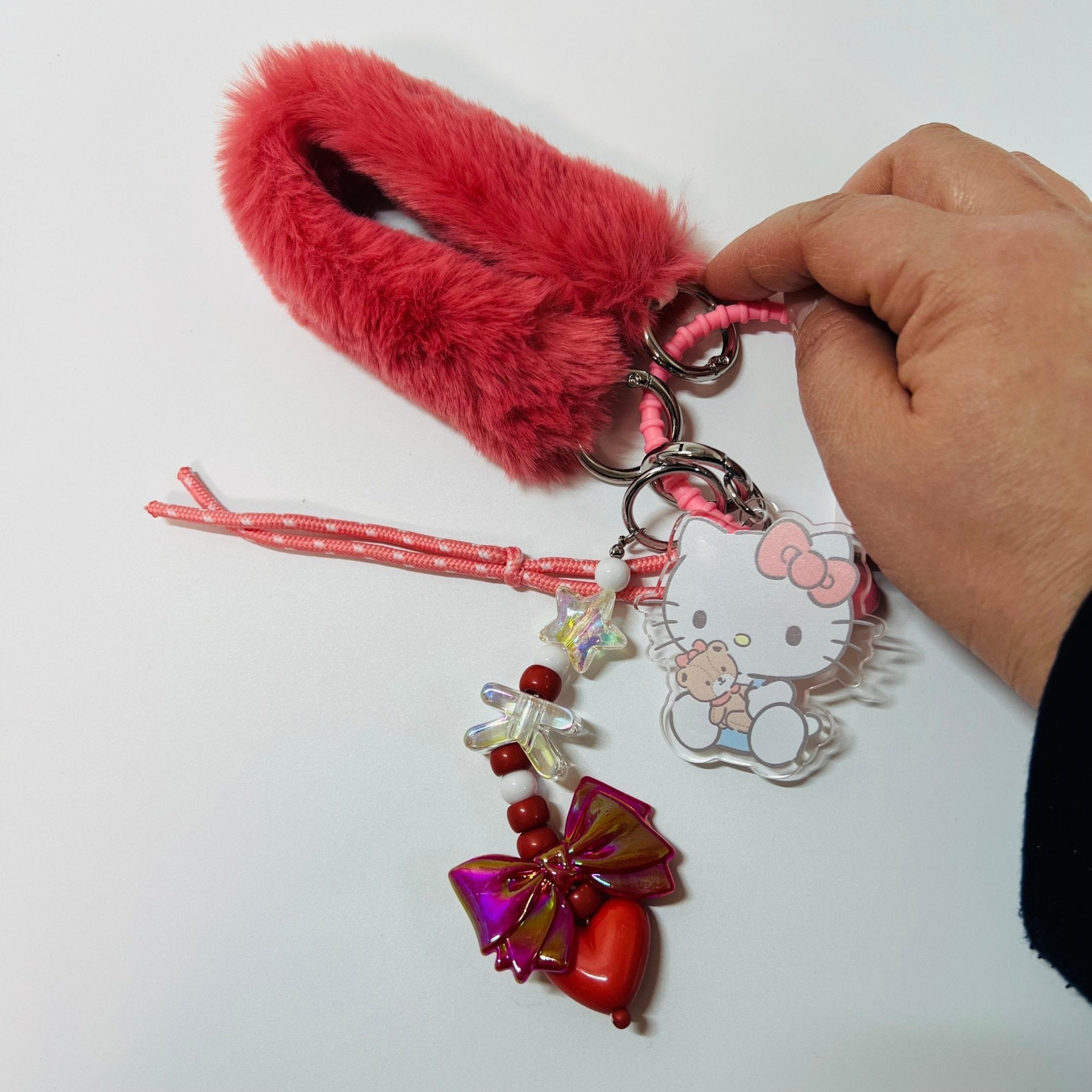 Acrylic Hello Kitty Hugging Tiny Chum Strap with Pink Fur Charm