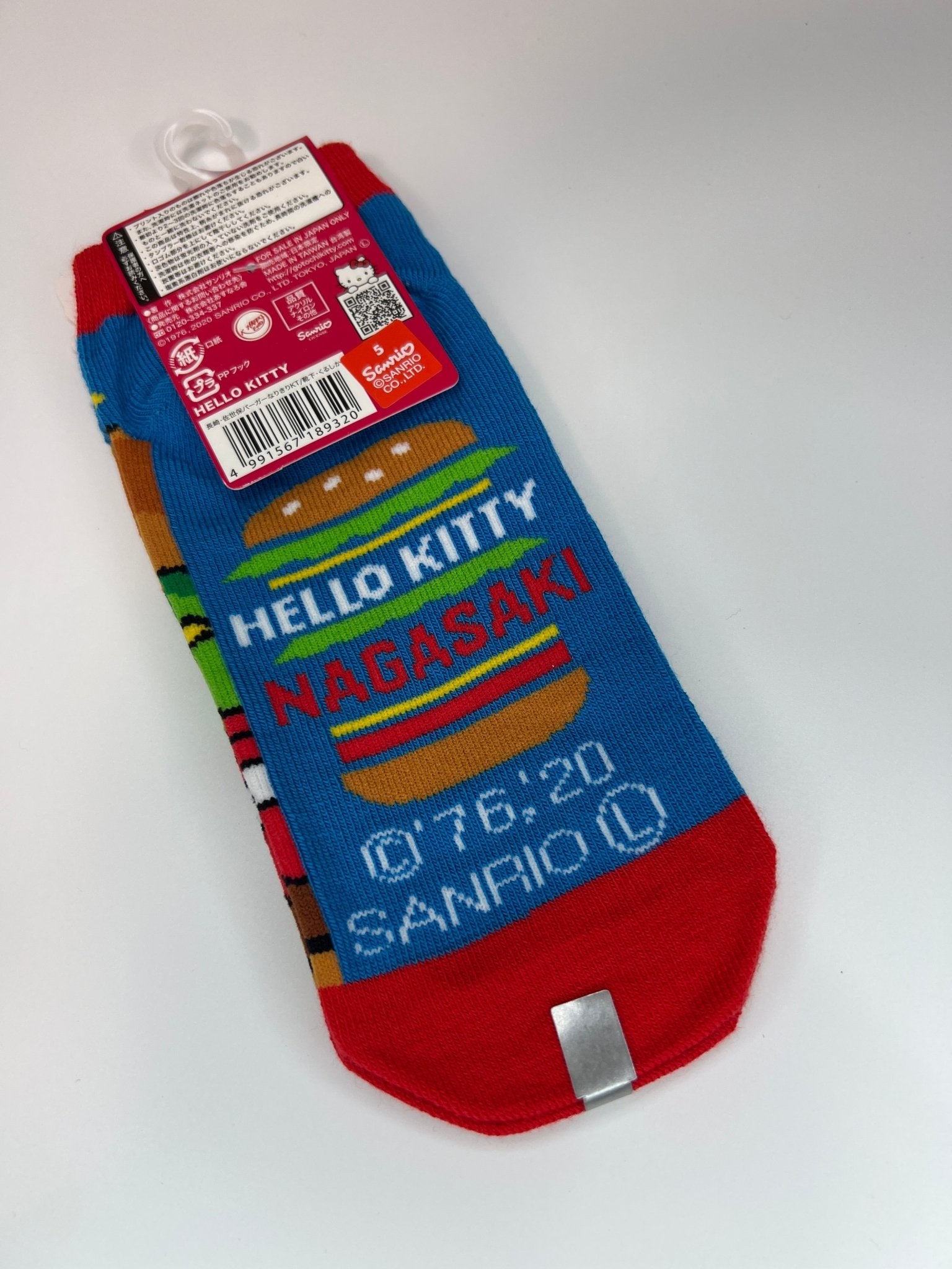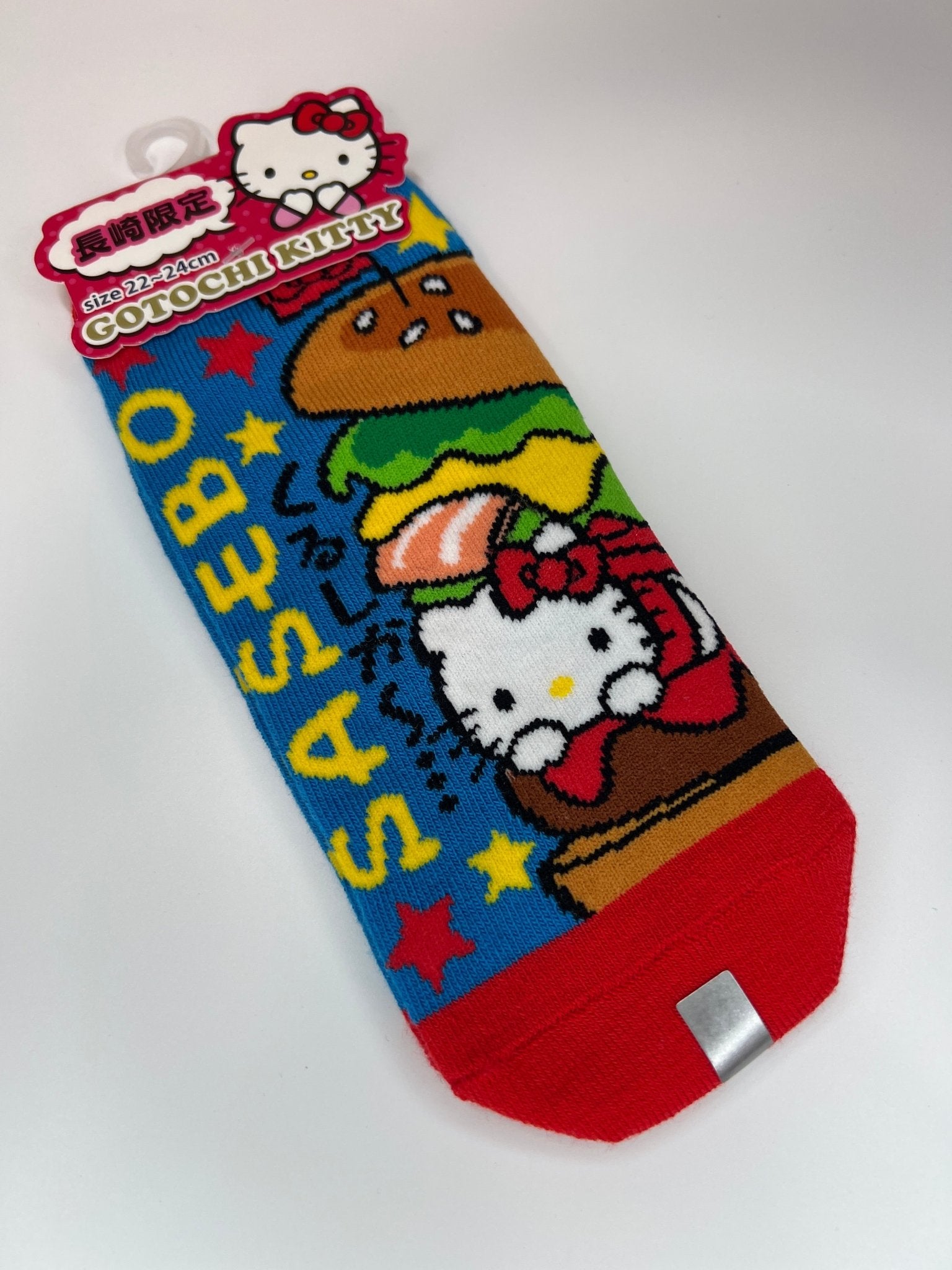 Sink your feet into Sasebo's most iconic flavor with these Hello Kitty socks! Inspired by the legendary Sasebo hamburger, these socks feature a cool, appetizing blue that captures the spirit of this Nagasaki culinary gem. Sized for feet 22-24 cm, they're a tasty tribute to regional food culture wrapped in Sanrio sweetness. Perfect for foodies, collectors, and Hello Kitty devotees alike, these limited-edition gotochi socks bring playful personality to your everyday wear. Snag this savory-cute pair before it's off the menu!