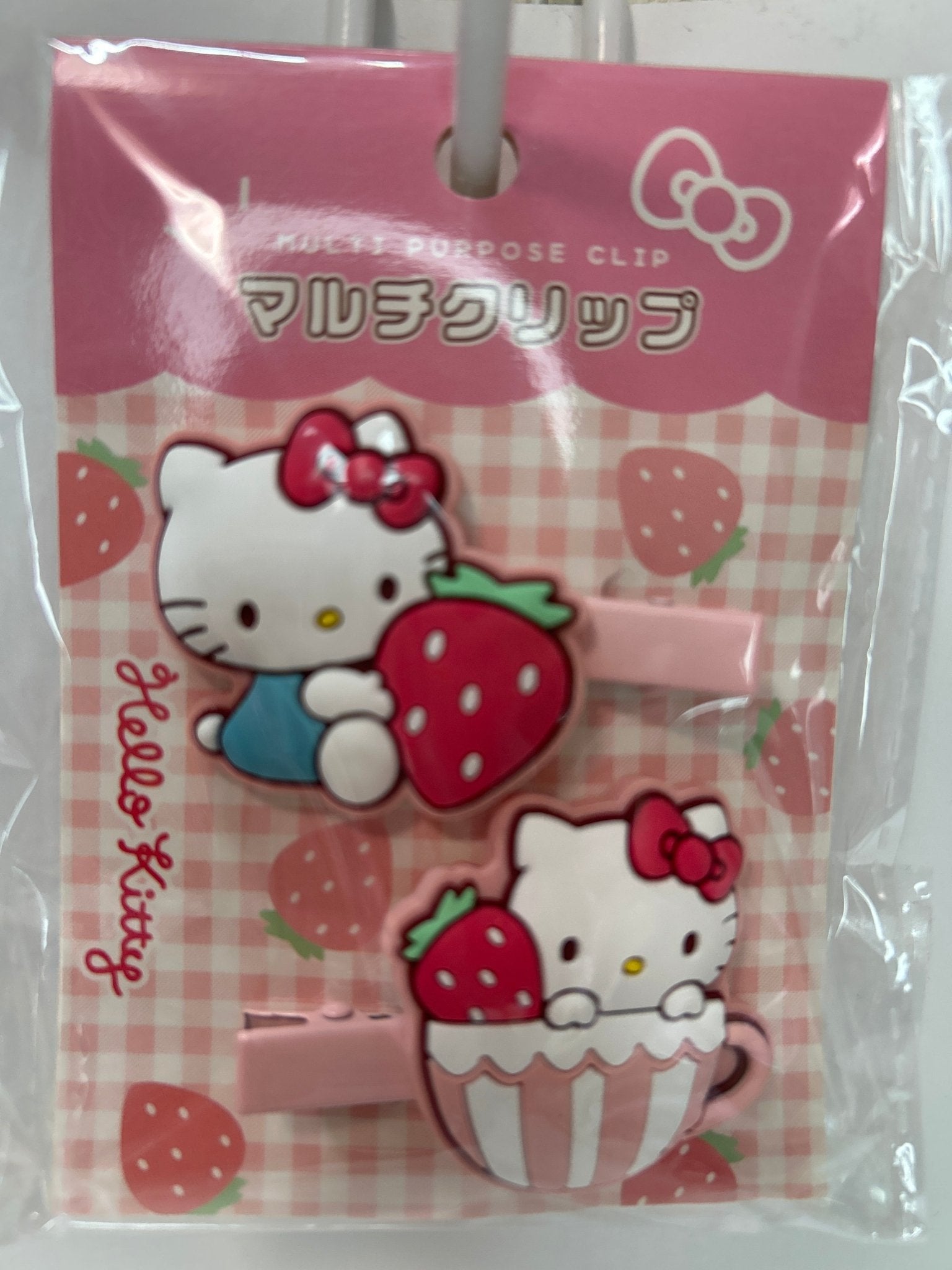 Keep your essentials organized in style with this adorable Hello Kitty multi-purpose clip set! This delightful duo features two charming designs—one strawberry and one teacup—each measuring a handy 40mm tall by 50mm wide. Perfect for clipping onto bags, notebooks, or organizing cables and cords, these lightweight PVC clips bring a splash of character to your daily routine. Each set includes both designs, giving you double the cuteness and versatility. Weighing just 20g, they're portable companions that add a playful touch wherever you need them most.